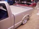 body drop with full tube frame, dupont silver arrow met paint. shaved ass end, with l.e.d's and plate frenched in back window, welded shut bed cover with gas door relocated in as well, shaved door handles and antenna, all body lines in cab including third break light, 1997 blazer headlights, and air tank in the bed.