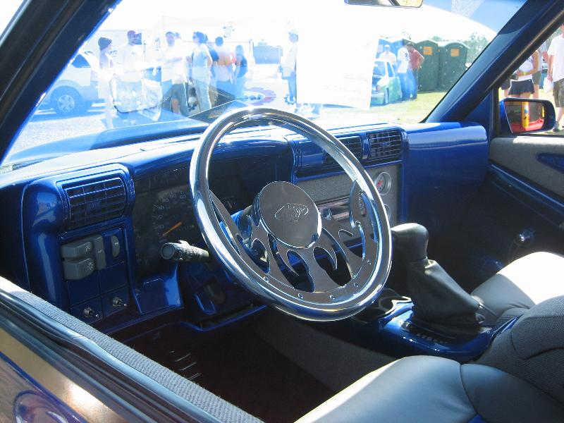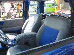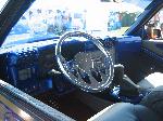 smoothed fiberglass dash, B.A.D steering wheel, billet-pedals,mirror,& window cranks, tweed-headliner with raised club logo, speaker box, center console, & door panels, all plastic pieces painted, Katzkin suede & leather seat covers, soon to have lokar shifter. Thanks to Shane @ MCP Automotive for all the tweed & seat cover work.