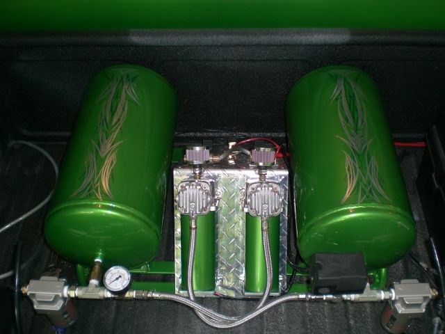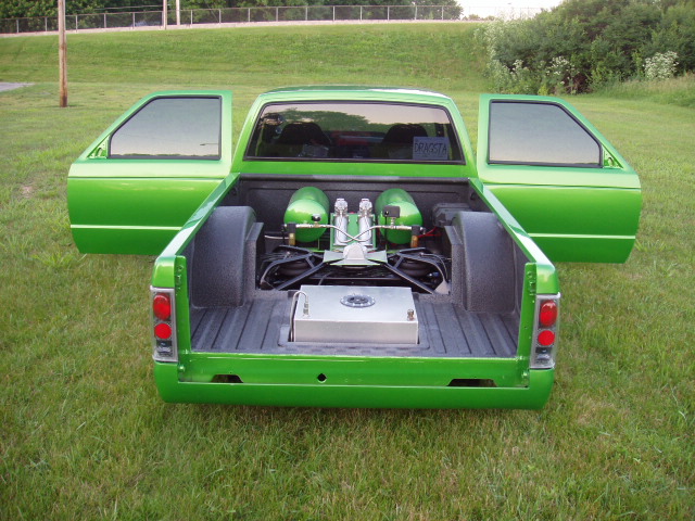 2,600 lb firestone bags on all 4 corners, triangulated 4 link, 10 switches, 1/2 fill 3/8 dumps w/ 1/2 lines, 2 viair 450 compressors, 2 5 gallon air tanks, 15 gallon aluminam fuel cell, tubbed, 2" drop spindles, tubed framing from cab back done by Trend Setter Customs in Dayton, Ohio