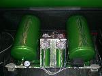 2 12" Audiobahn flame Q, audiobahn 2400 watt amp, and a 2.4 fairet digital powercap, and custom fiberglass/wood box painted pearl green to match the truck