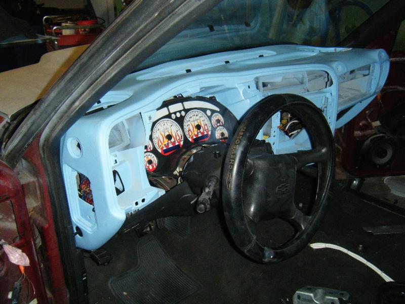 custom seats,Custom center console,A/c controles mounted in glove box,Where the radio,a/c controles,headlight switch,and the air bag lock has been all shaved up,I have a few things smooth and painted baby blue on the top and flat black on the bottom.