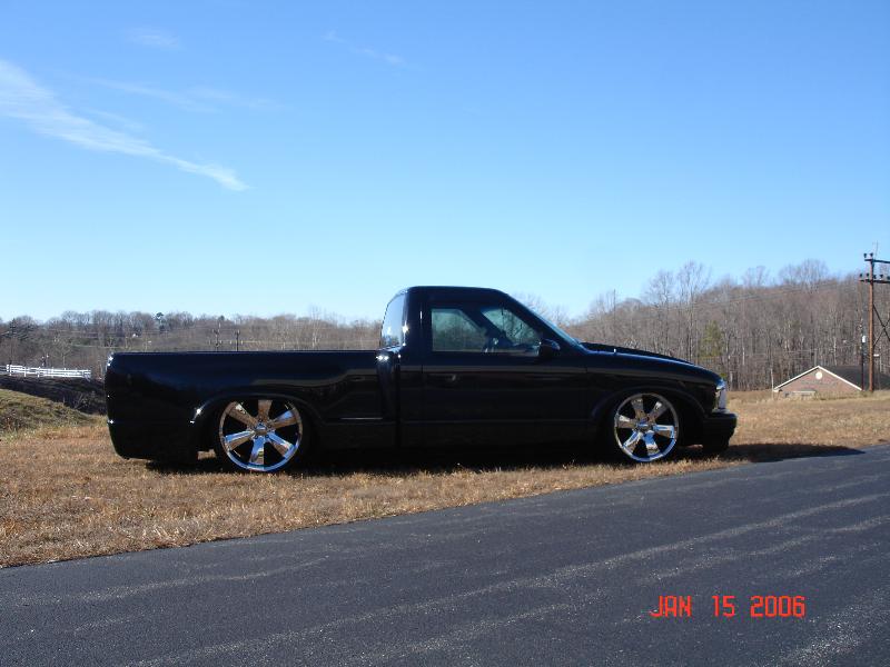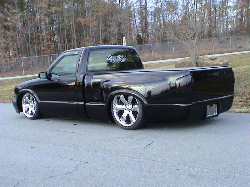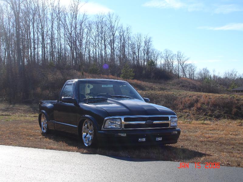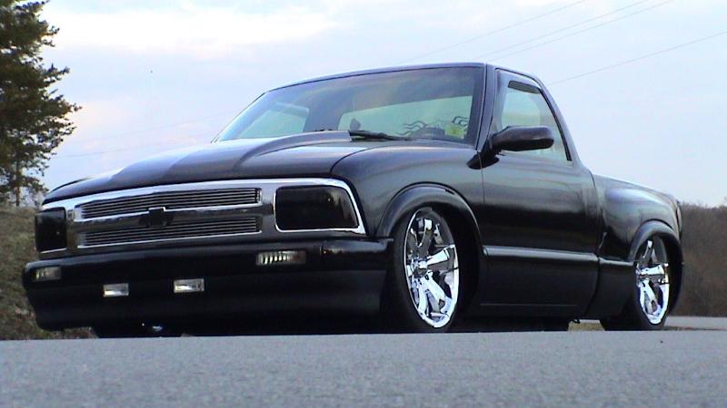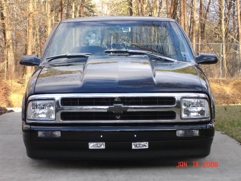 97 Blazer grille, grille inserts, 97 Blazer euro diamond clear headlights, cowl induction hood, smooth wiper cowl, billet wiper arms, street scene mirrors, shaved door handles, checkmate bed cover skinned with black powdercoated sheet metal, billet step plates, shaved and relocated tailgate handle and shaved rear steps, smoked third brake light and GTS tailight covers.