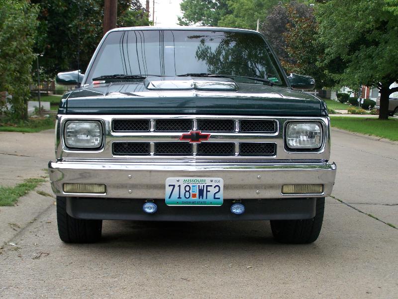 shaved tailgate, rollpan, sliding bed cover, metallic hunter green paint, imitation cowl hood,chrome grille, clear corners, chrome 93' bumper,all stock emblems and molding shaved off, sport mirrors, green neon under glow, hidden trailor hitch, flip up license plate.