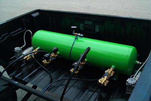 12 gallons of AIR, 2500 stones up front and 2600 stones in the rear. 8 1/2" Parker Gold valves plumbed with 5/8" OD line. 2 ViAir 450 compressors