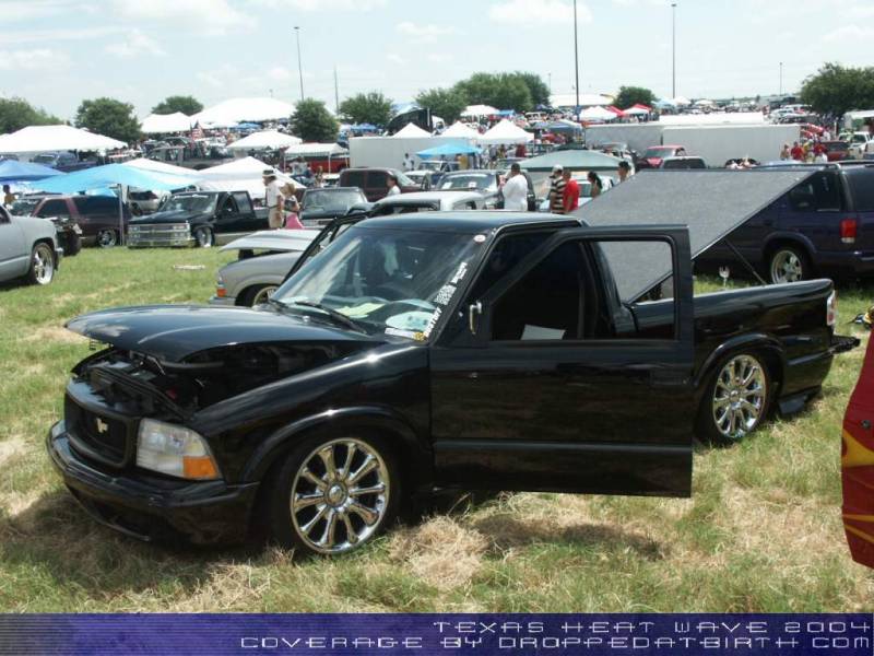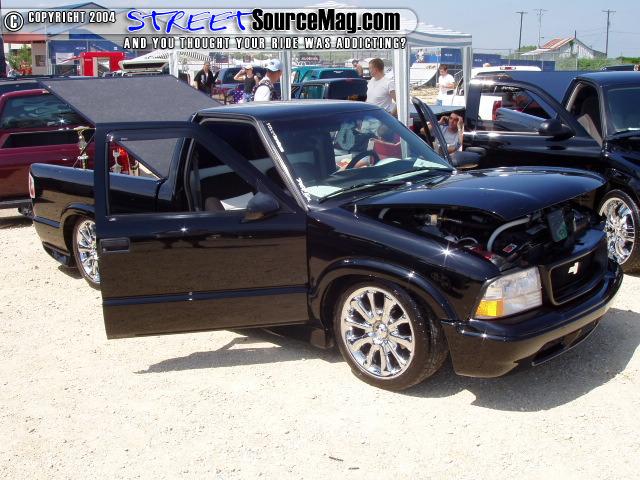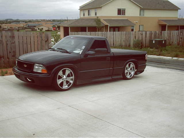 I replaced the stock s-10 hood with a sonoma hood. i have the extreme model so i have the side skirts. I added a roll pan and a flush mount cover from Checker Pro. the truck is covered in black factory paint. I shaved the mirrors. I converted the frontend to a GMC sonoma.