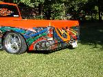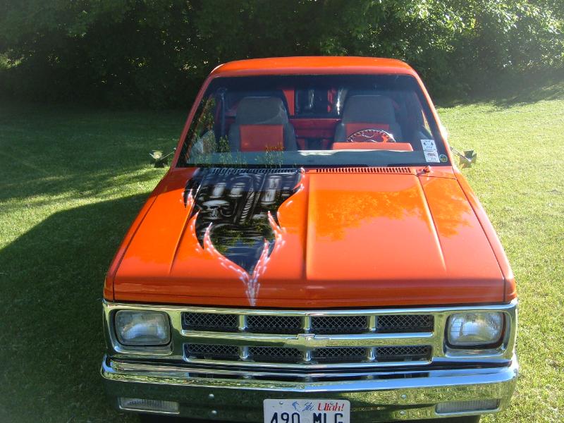 Shaved handles, locks, mirrors, antenna and squirters. planet color orange crush paint,with west-coast graphics and a bio-mechanical background
