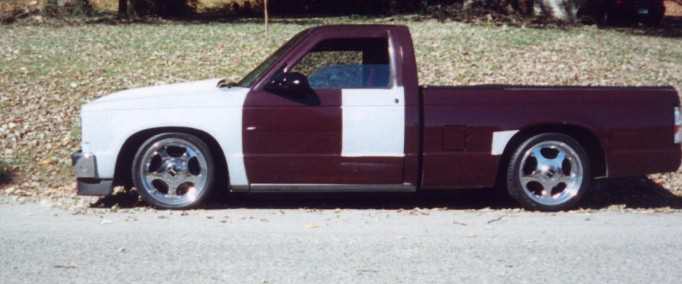 Black cherry pearl and primer. 17inch Prime 357's tucked in 215/45 and 225/40 tread. Shaved items are as follows--fenders, antenna, body moulding, emblems,door handles, rollpan, tailgate(w/license box), and cowl panel. billet grill, Pop-Up Sunroof, chrome bumper, custom cut bezels to match my shaved front corners, 3in Fiberglass cowl hood, SS Mirrors, tonneau cover, and Altezza Euro Tailights. Thinking about shaving the bodyline, welding on the rollpan, and adding some custom mirrors. IN PROCESS: Shaved front bumper, GMC grill shell with cut corners, new tailgate skin possibly welded shut.