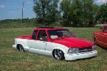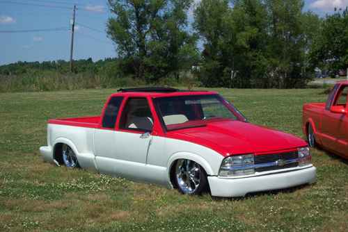 Fully shaved, with all metal steps, sheetmetal bed, and a 35x40 ragtop, painted viper red, and pearl white 2 tone with green stripe in the middle.
