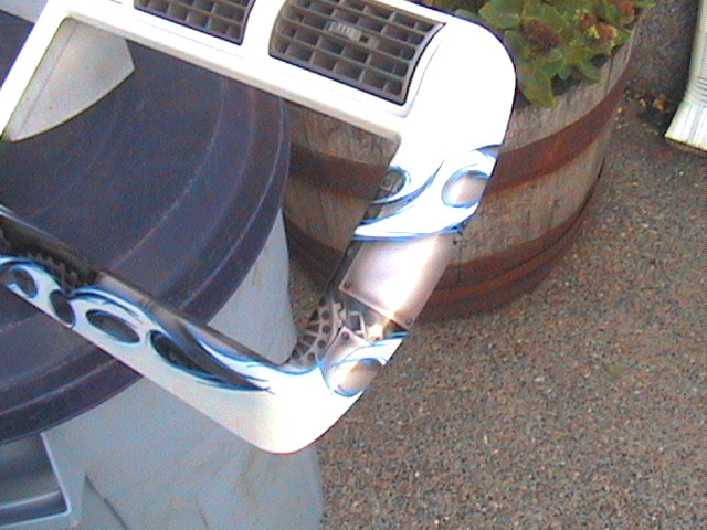 old skool Alter Images billet steering wheel, billet window cranks, Trenz billet flame rearview mirror,97 blazer seats, center console, painted white dash panel w/ graphics.