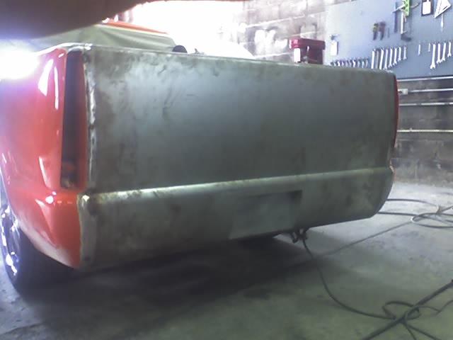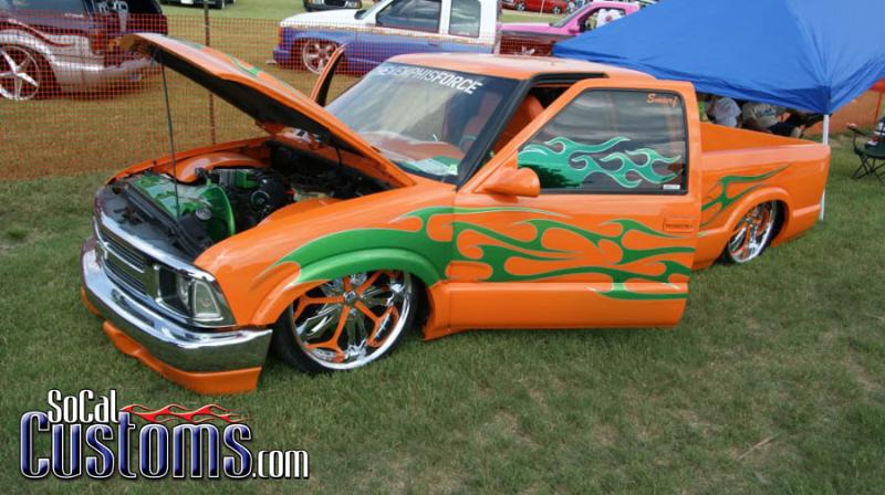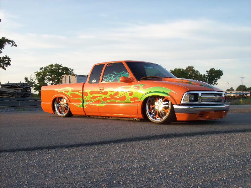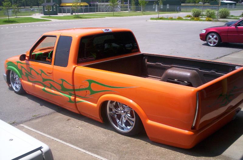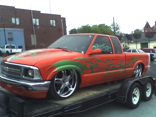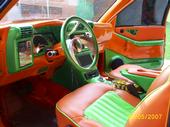 buckets out of a 2000 S-10 cover in orange and green vinal and a custom built fiberglass console and speaker box fiberglass dash door panels and headliner all other panels smoothed and painted