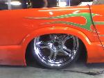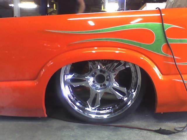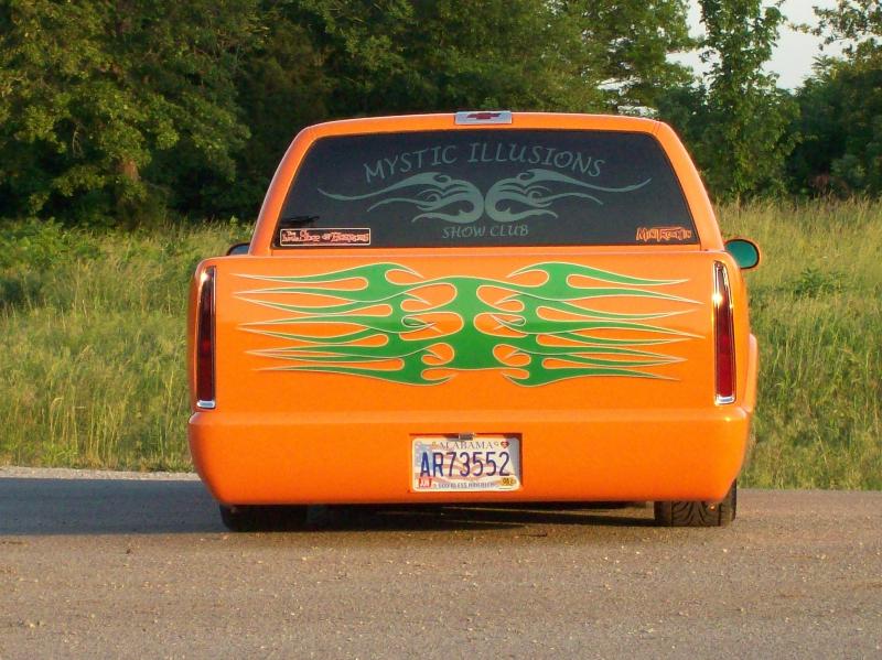 98' and up chrome front bumper with a painted stock valance projecter headlights 2nd gen cowl hood shaved rear end with 94 caddy lights tinted windows with flames in them billet grill billet bow tie billet thrid brake cover clear corner lights tangerine orange base with house of kolor limetime pearl tribal flames with ghost flames