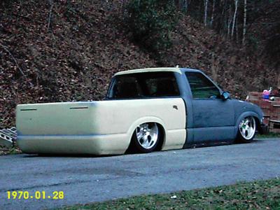 bodydropped, shaved, sheetmetal bed, high build primer, cal hood.