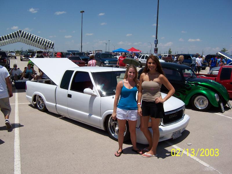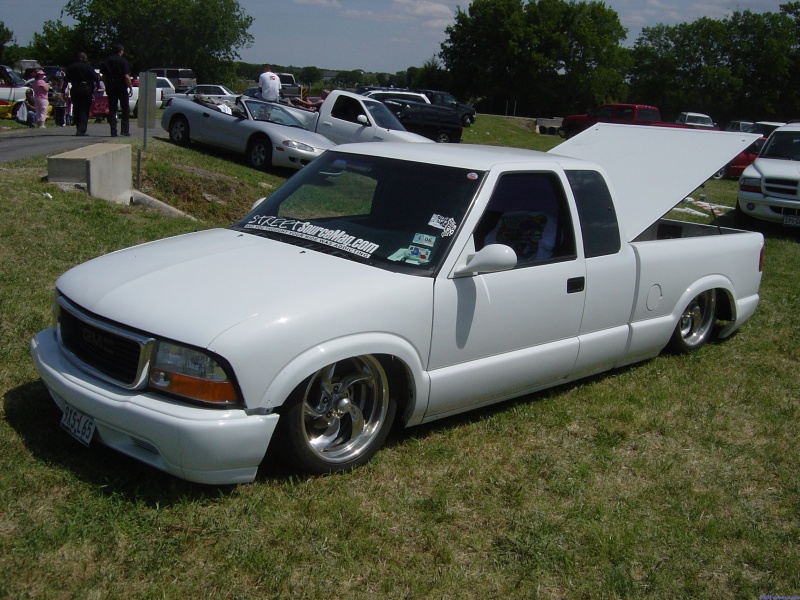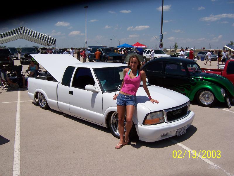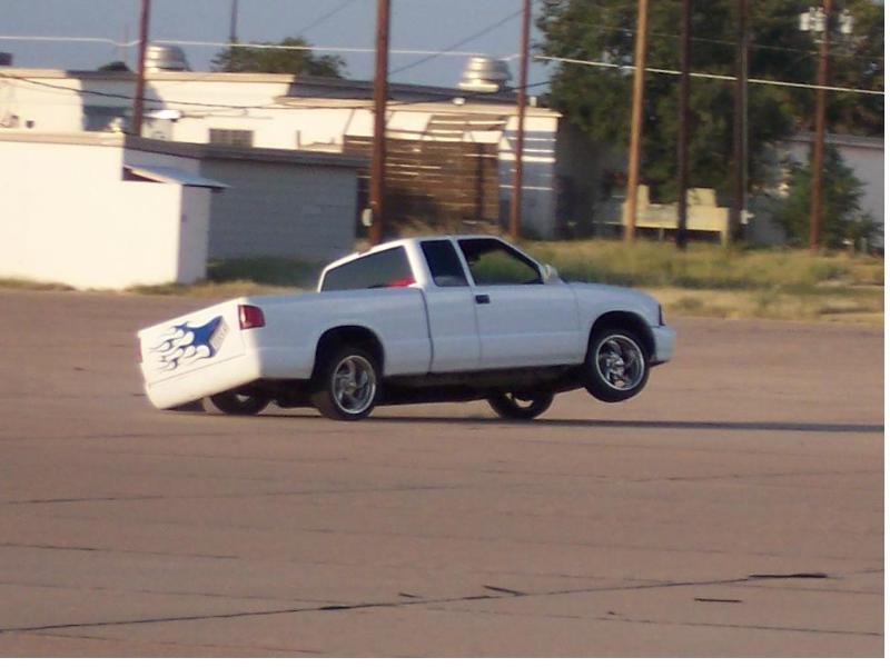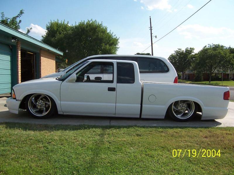 Whit extended cab, shaved tailgate handle and roll pan, frenched in license plate in tailgate at a 45 degere with painted triable flames coming off of it, 98-03 sonoma front clip