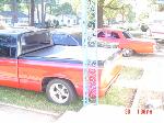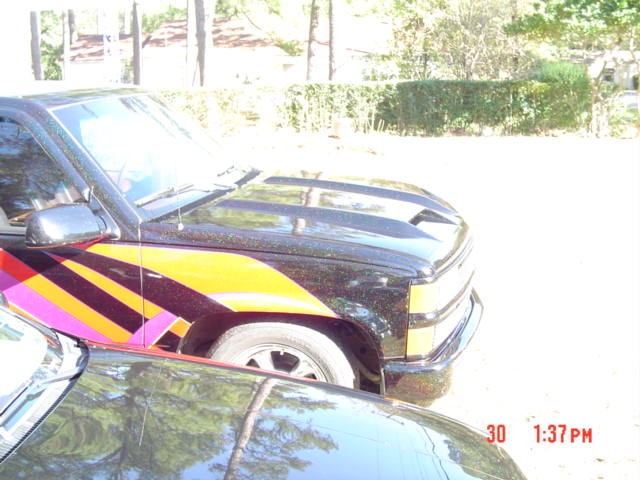Shaved bed, electric roll down rear window, custom hood, custom red paint with way too much blue pearl. so yes it mostly looks pink