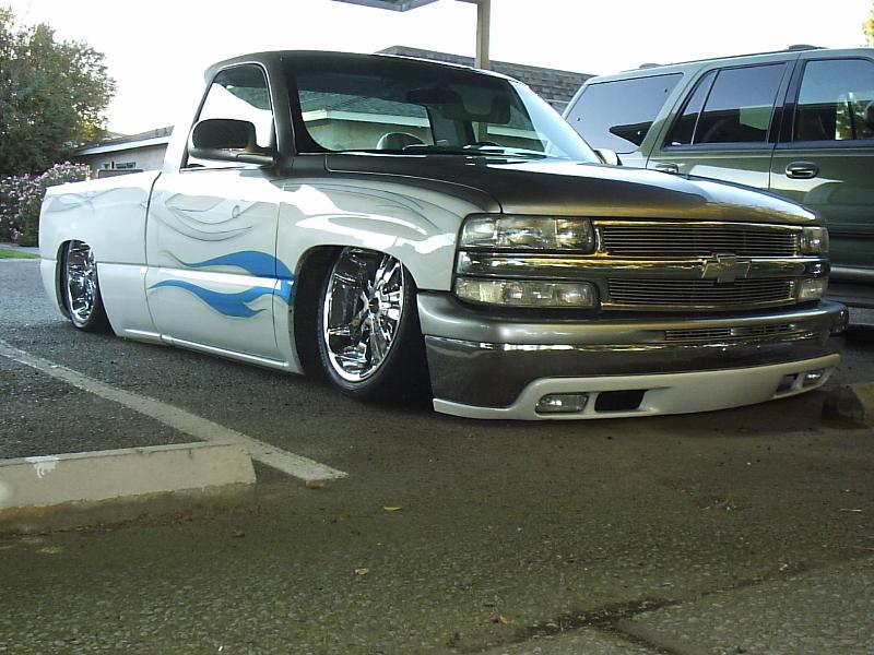 Tahoe Grille, bumper and grille Billet inserts, shaved doors, gas filler door, handles, rain gutters (above and below back glass), Tail lights, third brake light, and molded in tail gate. 8" LED tails (with pointed ends not round), chopper turn signals by pro 1, cab pushed back 1" (to close gap between bed and cab), smooth wiper cowl. Two tone HOK paint designed and masked by me striped and some airbrush. matched line-x bed liner