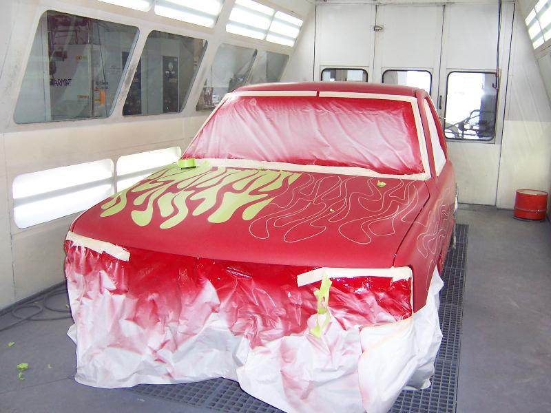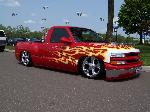 Shaved: Door handles, tailgate handle, third brake light, custom flames by Lenny From Krazy Kolors