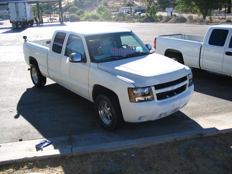 Rocking the white primer front and back! Shaved Tail Lights, FBI Rollpan welded in, FBI Tailgate Handle Relocator, FBI Licenseplate Box Frenched in Tailgate, Shaved Door Handles, HD hood...Rockin magnetic trailer lights for now. 07 Tahoe front end is still under construction...