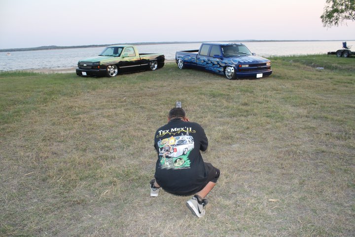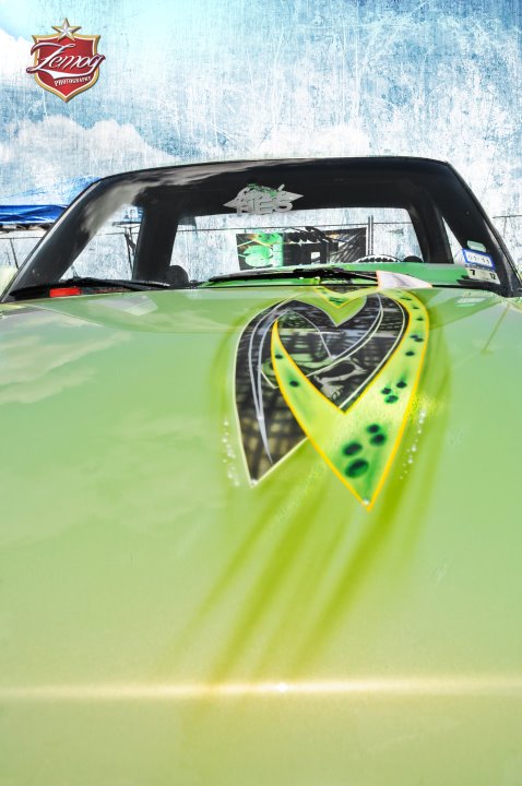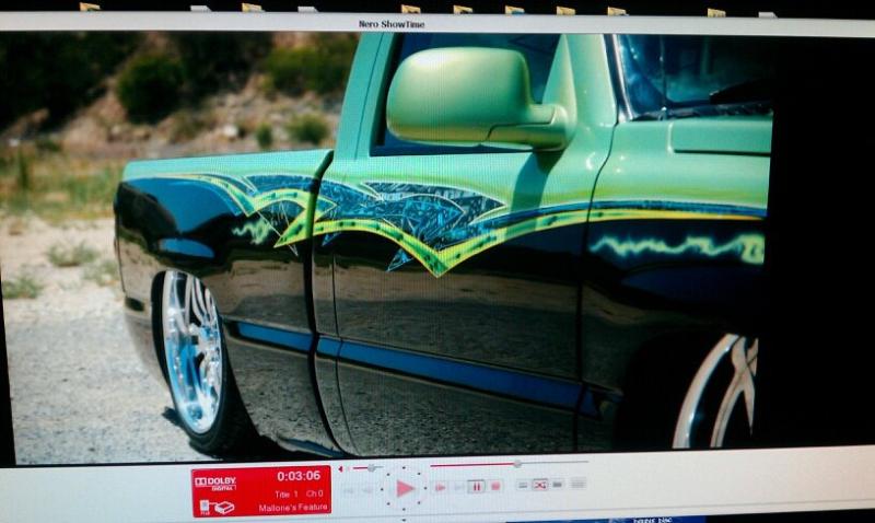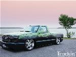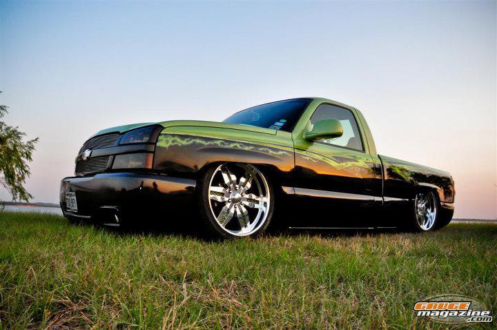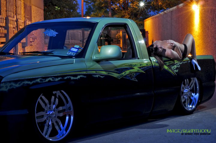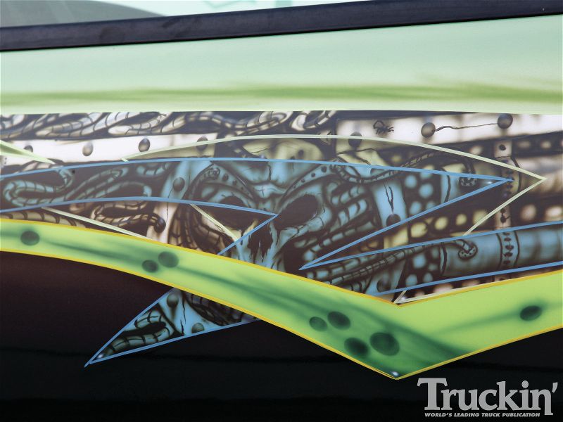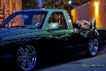 Shaved door handles, tailgate handle, gas door and emblems. Relocated gas filler to bed. Tubbed and smoothed bed. SS front bumper, roll pan in rear. Billet grille. Smoked out lights. Line-X in bed. Custom two tone paint with VW Cyber Green and Chrysler black metallic. Bio-mechanical graphics airbrush and pinstriped. Paint done by Patrick Reid out of Galveston, TX.