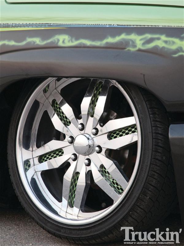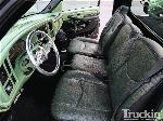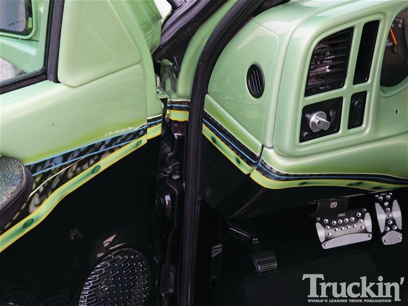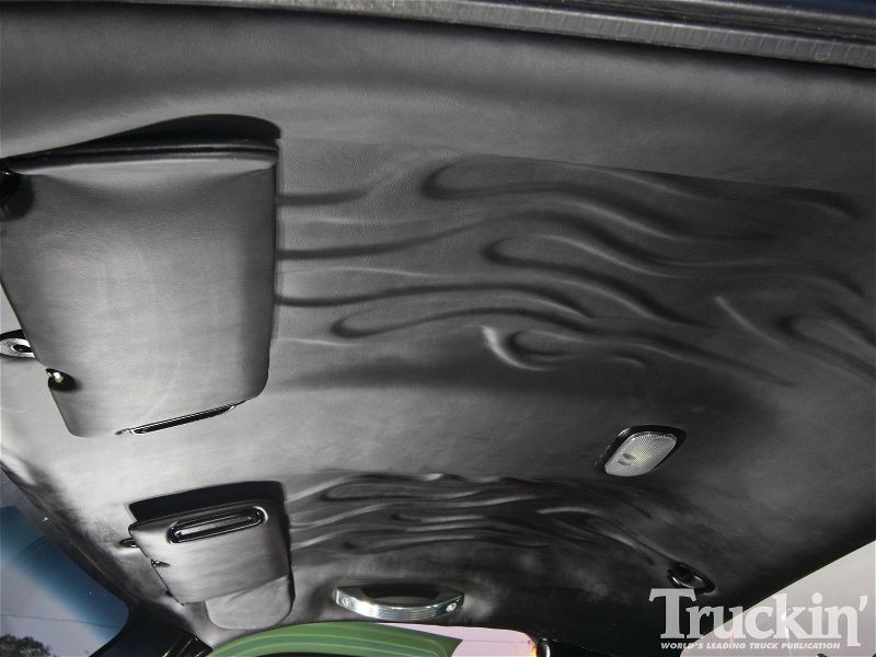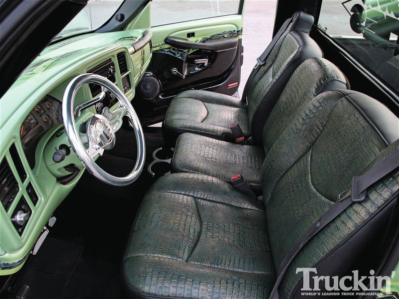 Sanded and smoothed dash and door panels. Removed stock headrests. Every plastic in the truck has been painted. Interior done in green gator and black vinyl. Custom flamed headliner done in black vinyl. Black carpet. Custom billet SEVERED TIES steering wheel by Colorado Customs. Billet SEVERED TIES rearview mirror, billet knobs, billet shifter. Interior done by Jerry Vincent -Jerry's Custom Upholstery out of San Antonio,TX.