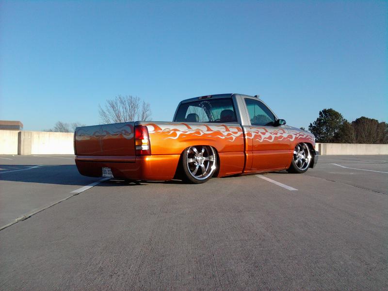 shaved handles/tailgate, custom paint (stock scion burnt orange with "ice" in the flames on top of silver) Bed is tubbed out, all round...