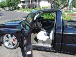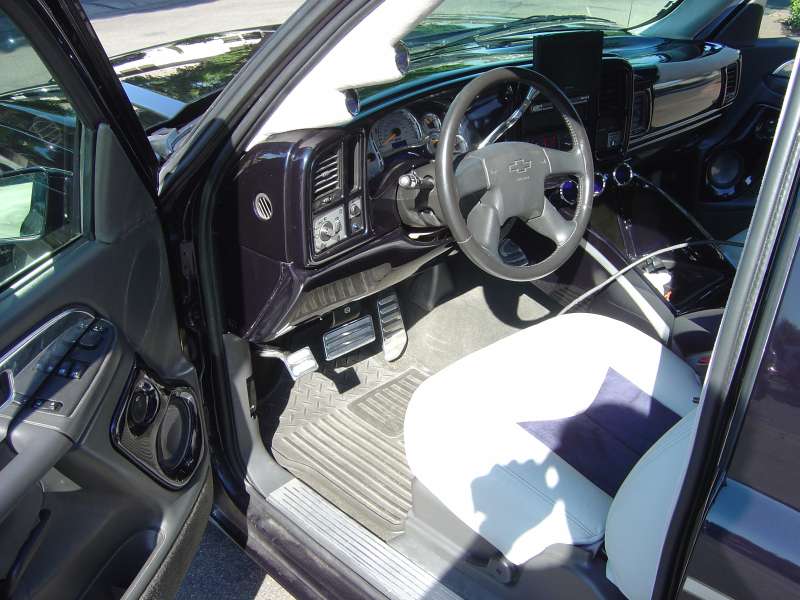 Nu Image dash cover painted to match the truck. Smoothed and paint-matched dash. Trenz door panel inserts, billet shifter, billet door sills. Nu Image billet gauge surround with platinum gauges. Dakota Digital air gauges, Dakota Digital tire pressure gauges, Dakota Digital boost gauge, and Dakota Digital clock. 9-switch air controller. Full Enduratex visions and suede interior custom-stitched by Stitchcraft and custom center console and amp-rack by South Coast Speed and Sound.
