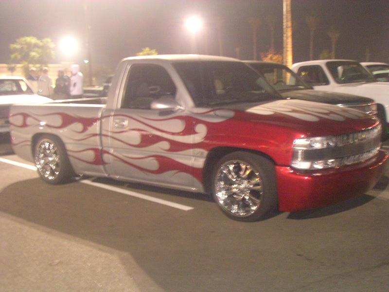 fully shaved in the back, LED'Z located between tailgate and rollpan, shaved stake pockets, 3rd brake light, 3D Billet Flame grille, smoothie steel bumper, clear lights in front, SS mirrors, AVS flame license plate holder, PAINT done by MIRANDAS KUSTOM in Visalia CA, paint is civic silver base w/ Razberry Pearl from House of Kolors tribal flames, airbrushed skulls throughout flames and on bumper