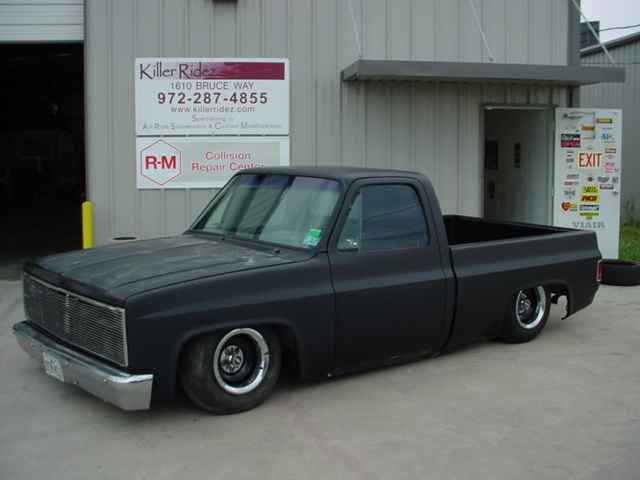 Flat Black, shaved handles, mirrors, drip rails, molding on the cab, emblems, side markers, tailgate, gas door(relocated to bed)...Thanx Killer Ridez