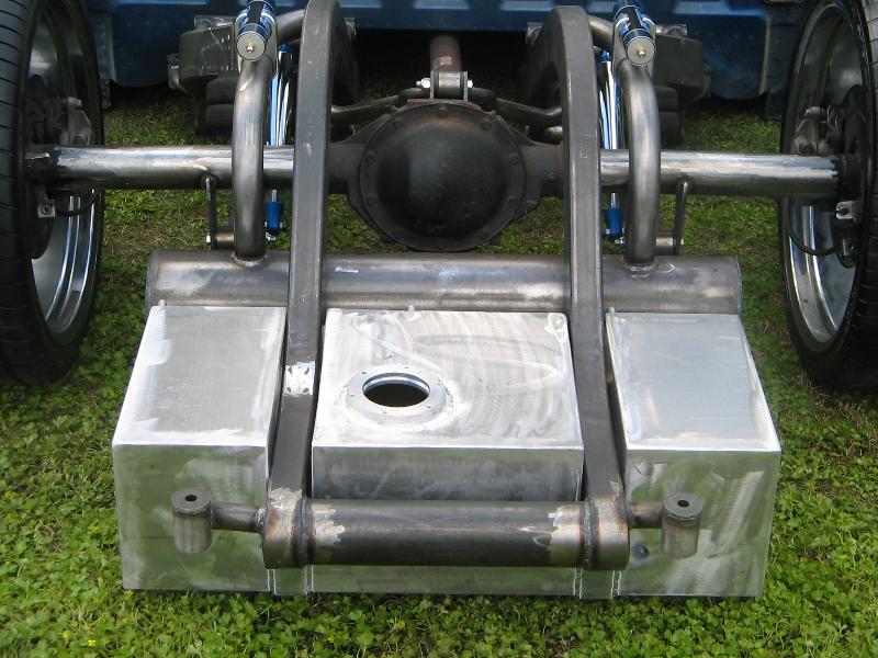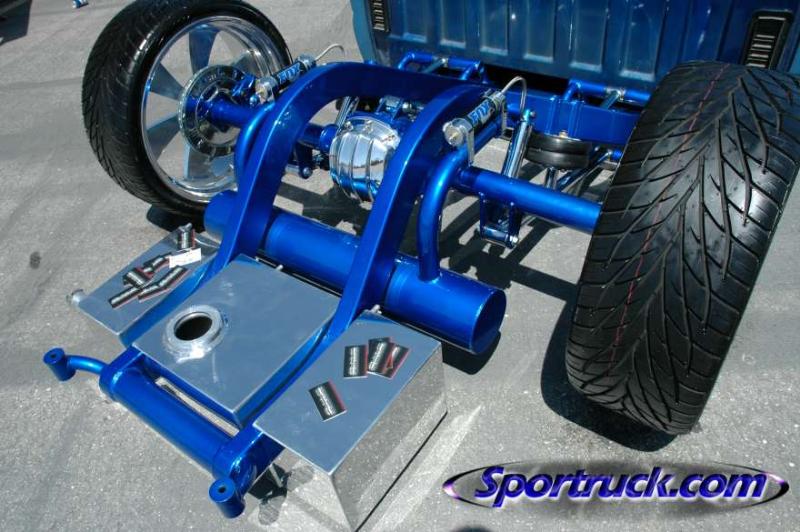 4 3/4 stockfloor bodydrop using a custom built firewall back frame. Candy blue powercoat, fox shocks, chrome, custom polished fuel cell, custom built control arms, mandral bent rails, slam bags, parker valves, chrome drive line, all wires and lines hidden inside of frame