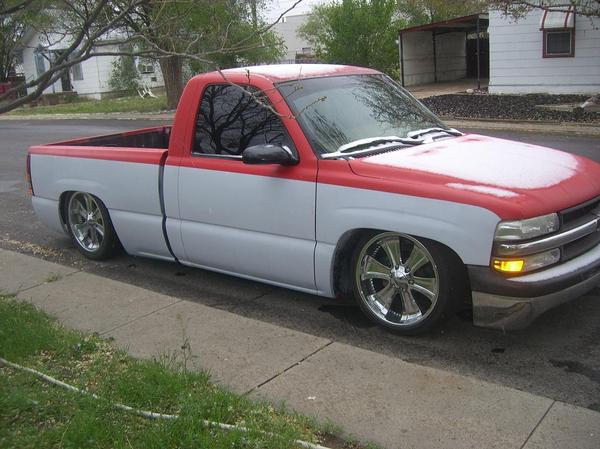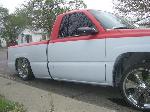 primer TW0-TONE WHITE AND RED, suidice doors, roll pan, shaved tailgate handle, shaved bed stake pockets, ss mirros,shaved handles, paint matched bow tie, flowmaster, removed moldings, devious customs fuel cell