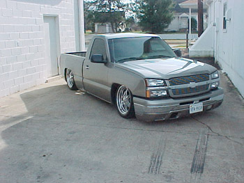 escalade rear door handles, shaved third brake light shaved tailgate and molded roll pan shved stake holes smoothed and painted bumper pad and lower valance street scene mirrors ragtop billet grill and bow tie