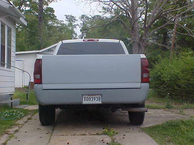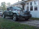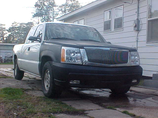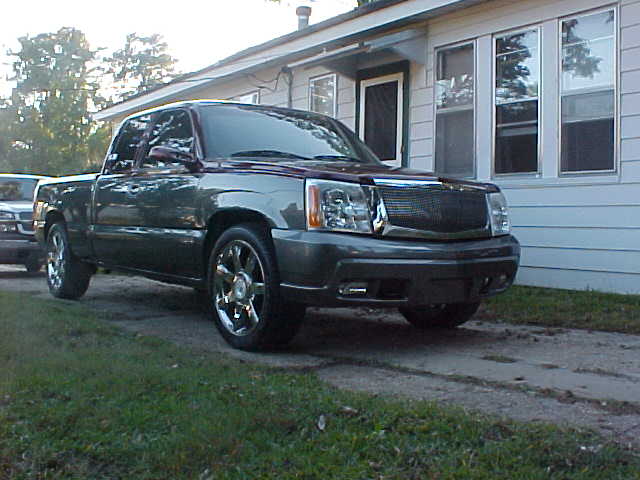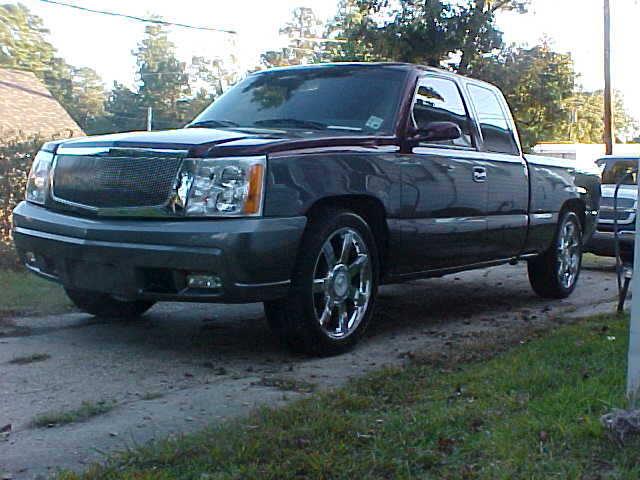2005 Escalade front end with vertical billet grille, shaved tailgate handle and rear spoiler, molded in rollpan, sport mirrors