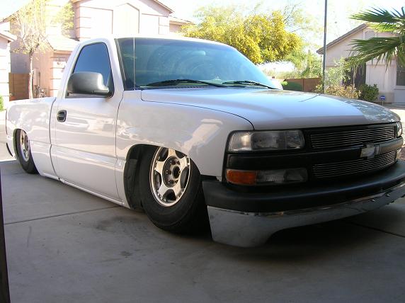 Bagged, parrallel four link in the rear combined with watts. Built some upper control arms, modified lowers to accomidate stock 16's and stock spindles while still laying a 30" in diameter wheel/tire combo.