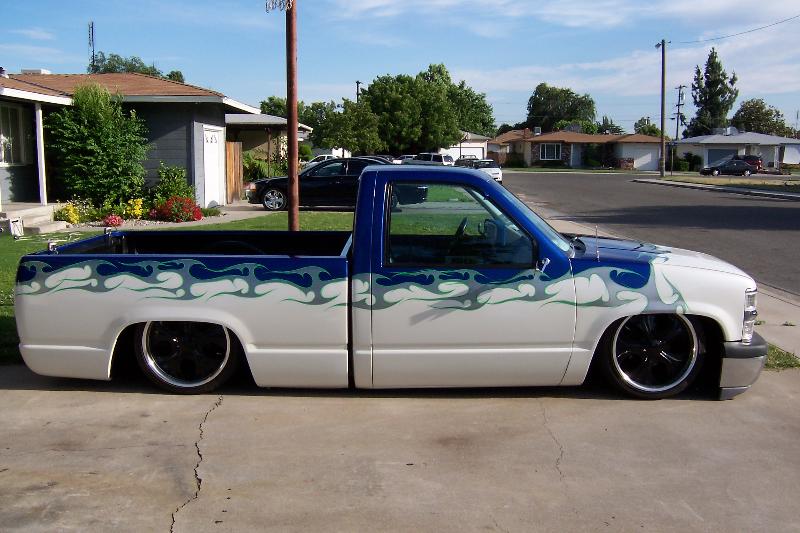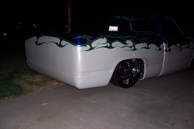 fully shaved tail lights, tail gate welded shut, roll pan, doors, upper bodyline, stake holes, mirrors,section an inch either way out of the bumper,bed tubbed,custom maltese cross mirrors,custom two tone paint pt cruiser electric blue on top escalade white on bottom with metallic silver flames seperating them striped in hok lime green