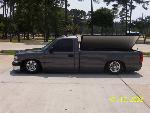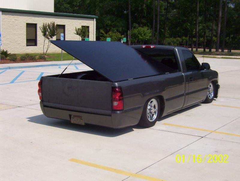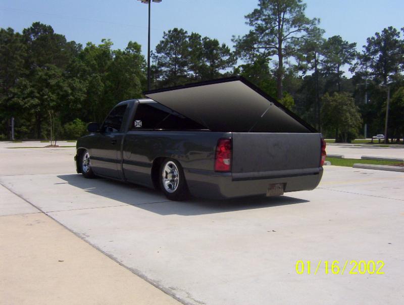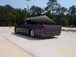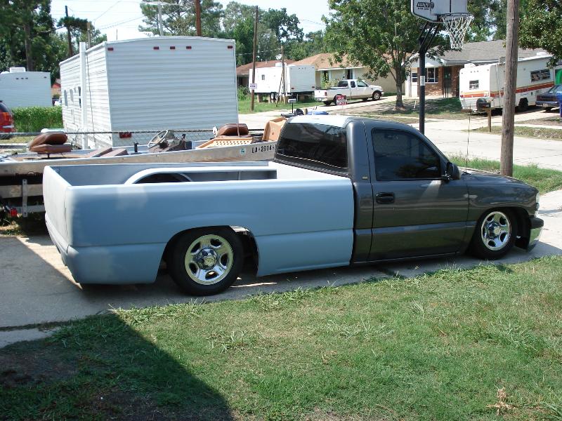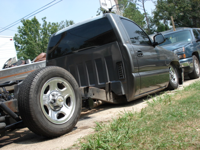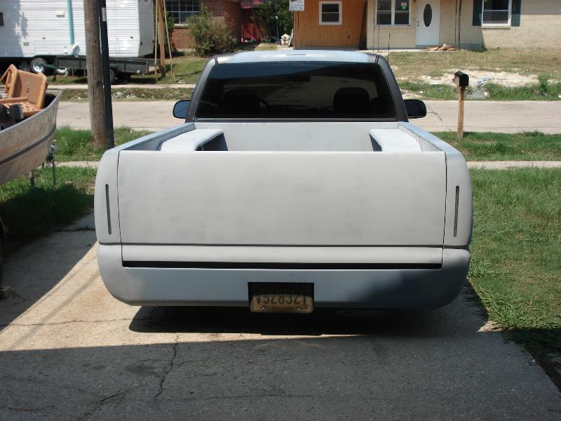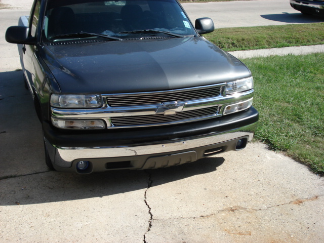 Chevy tahoe grille shell with carriage works billet insert & billet bowtie. Z71 tahoe front airdam. Molded rollpan and shaved tails and 3rd BL. Replaced with Hi-Tech LED's. Tubbing the bed and sheetmetal bed floor in progress.