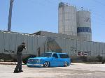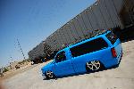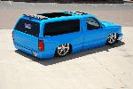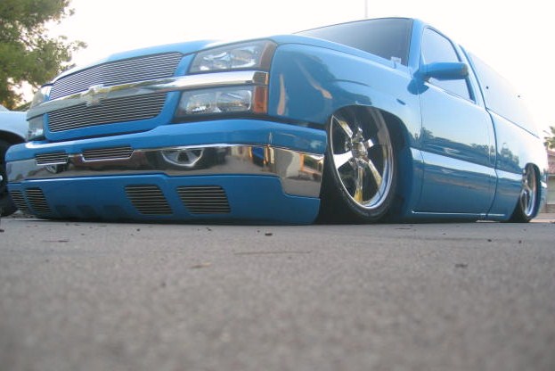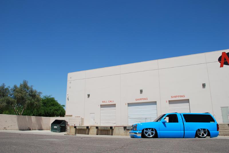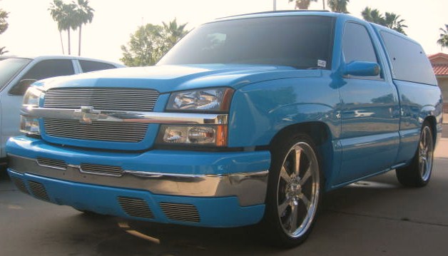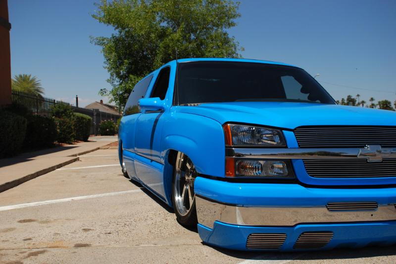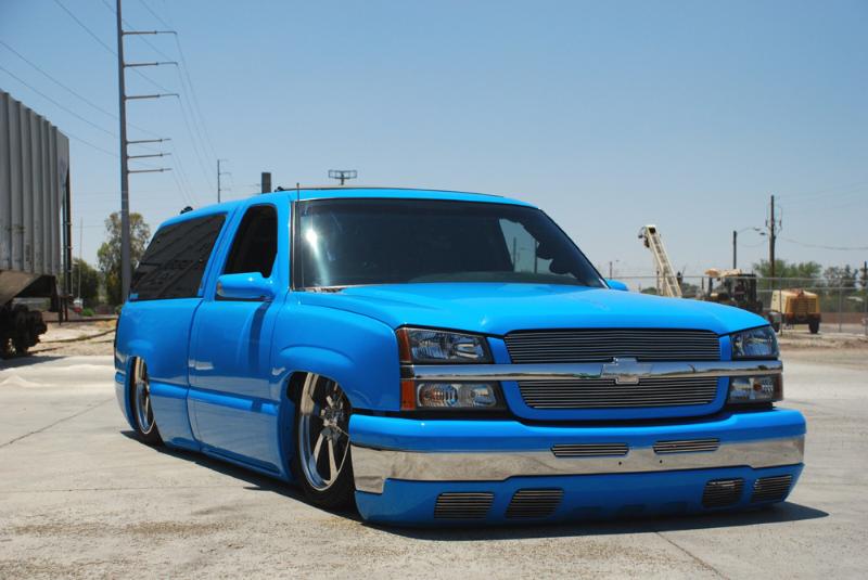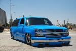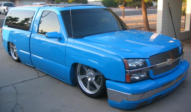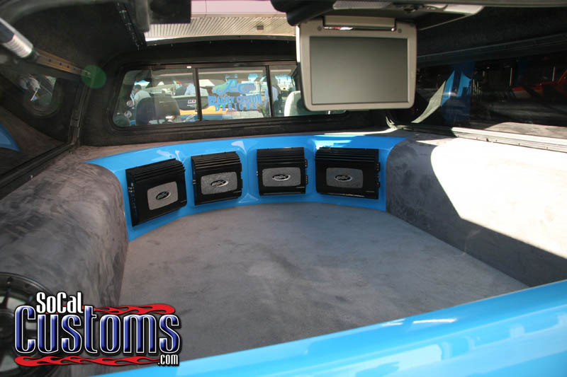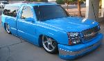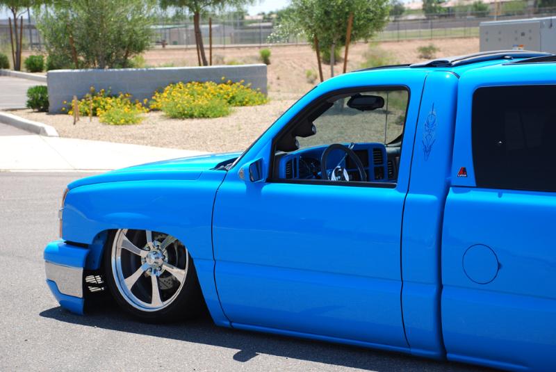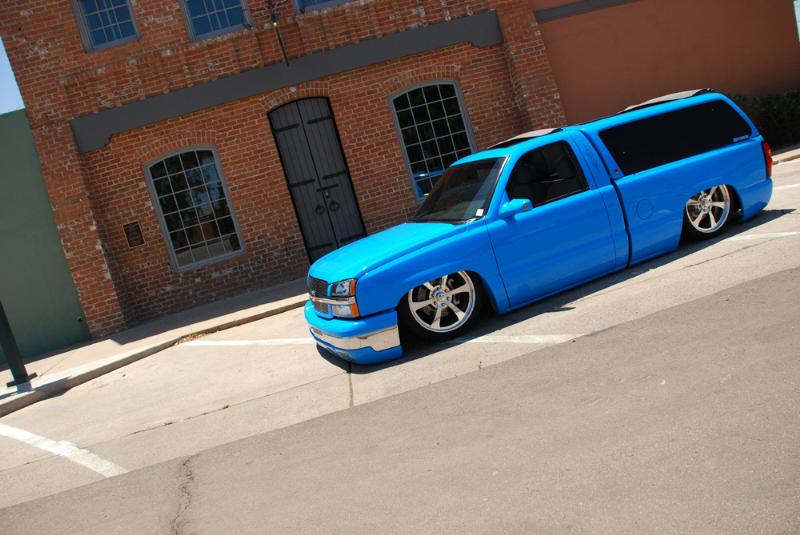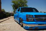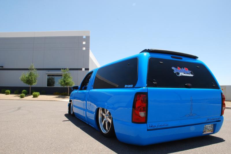Shaved door and tailgate handles, Sir Michaels roll pan, Leet shell, billet front end, Street Scene electric mirrors, dual rag tops, Porsche Riviera Blue.