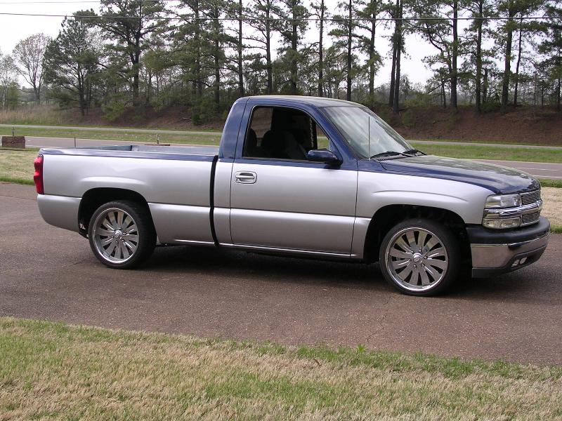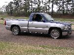 Two tone paint Dupont Chroma-Base Silver Pearl Metallic and Chroma-Base Indigo Blue Pearl Metallic, Billet Grill, Billet Bowtie, Euro Clear Parking lamps, Shaved Tailgate, Tahoe Chrome Grill, Hyper White hi/lo, Street Scene Electric Sport Mirrors, molded in Sir Michaels Rollpan, 2003 Silverado Taillights, tubbed out the bed and sheet metaled the floors and walls