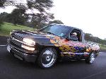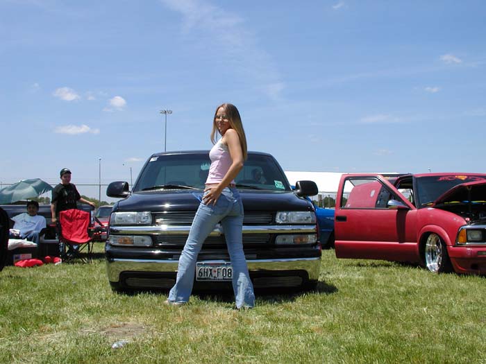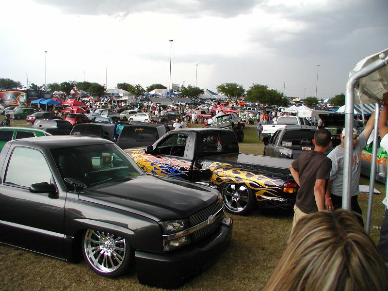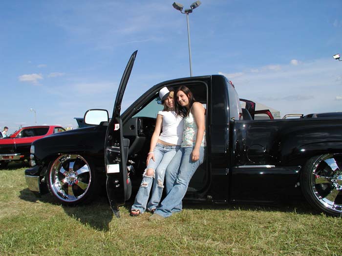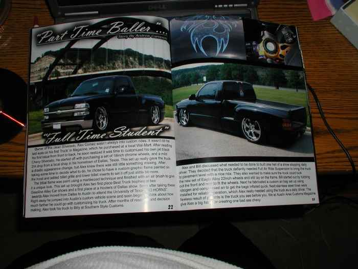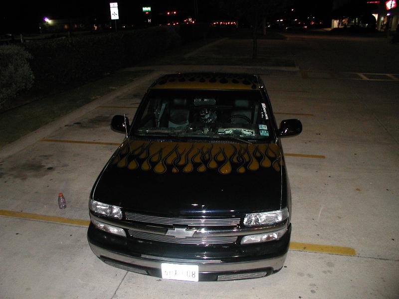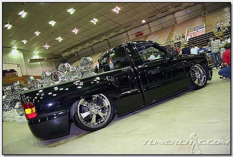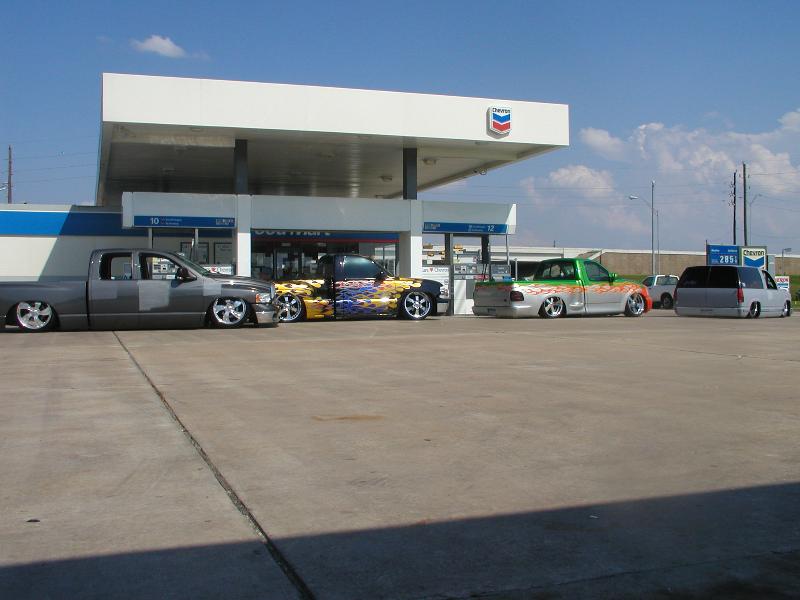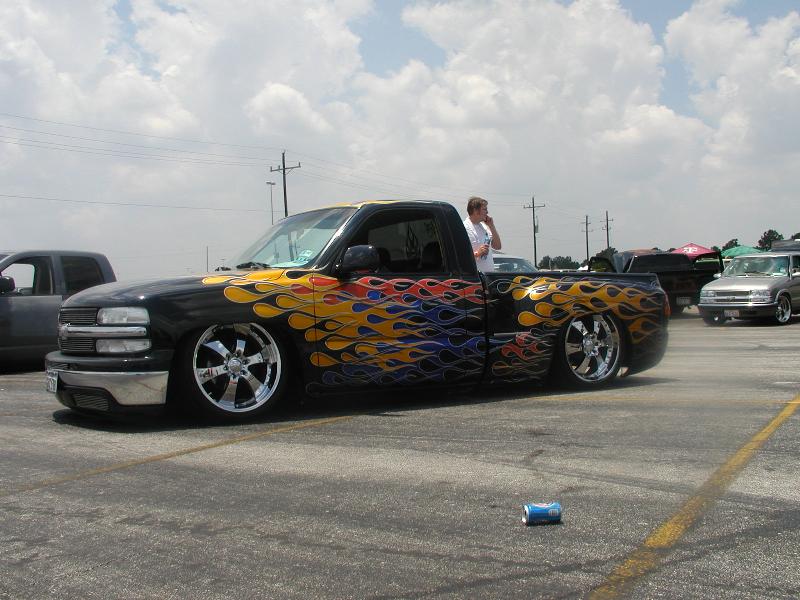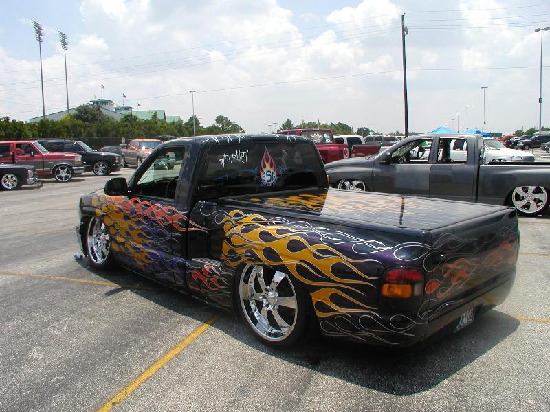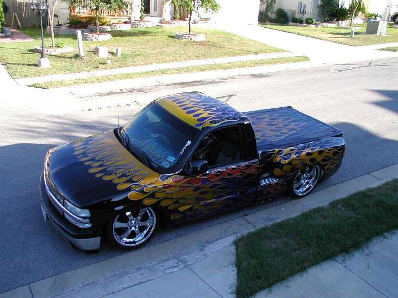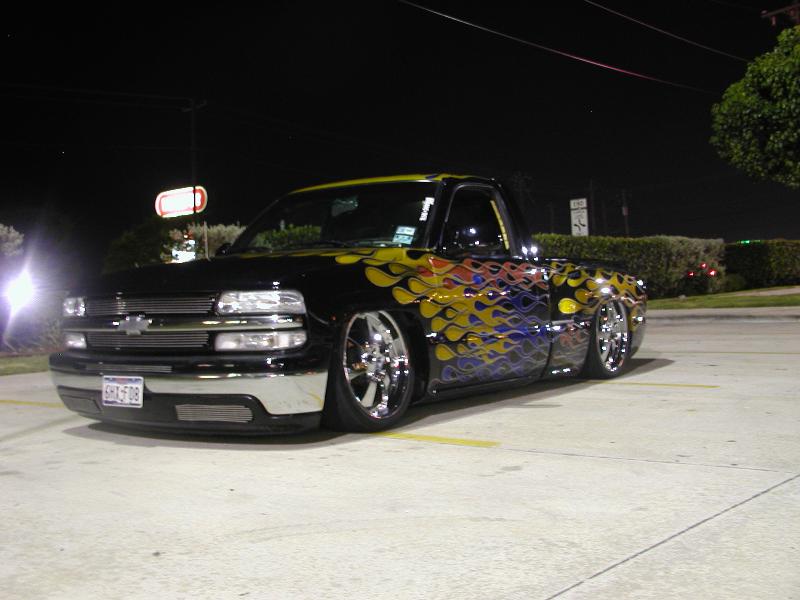slam bags, 1/2" steel braided lines,450 E-valves, viar 380c running to a 5 gal. reserve tank both under the bed, and 2 nitrogen bottles in bed, tubbed to tuck 22s, custom SSC 2-link in the rear with y-link. (Work done by Bill at Southern Style Customs in Austin Texas (512)-825-7369)
