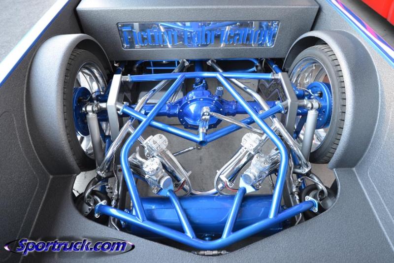 3/4 framed, 3" body drop, 6-link w/ one off billet watts link. custom aluminum fuel cell, aluminum cross member added, 4 480 compressors, entire chassis powder coated and then wet sanded and air brushed to match exterior paint work. all suspension pieces powder coated candy blue, rear differential rebuilt by performance industries w/ all new internals and posi, all aluminum pieces polished, all new steering components, new SSBC front brakes