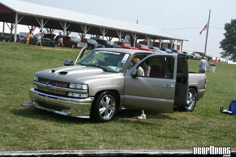 Molded rollpan with 45 degree license plate box, shaved tailgate, shaved emblems and trim, shaved fingerhole from stock gas door, ram air hood, chrome bumper top, chrome bumper valance, billet grille, custom front chevy logo, billet antenna, LED taillights, clear corner markers, chrome headlights, 20" chrome wheels, chrome door handles, underbody neons, and more that I can't think of right now.