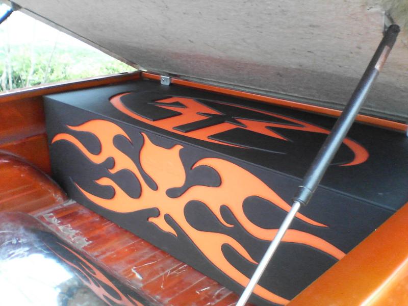 alpine head unit , rockford, battery, rockford fosgate 50 farad capacitor, rockford fosgate t10001bd amplifier, (2) trf2215, and custom speaker box