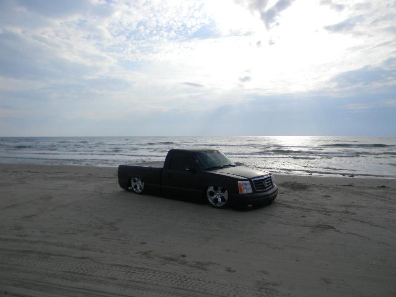 05 cadi front end,shavered up,billet motorcycle gas cap,camero lime green with flat black flames,sheet metal bed with Grant tubs