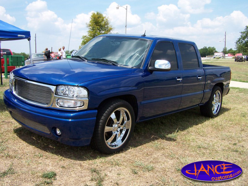 The exterior has had the front clip changed over to the denali front end, with billet inserts inserted into the grill and the bumper. Also has some upgraded projector headlamps and park lamps. The factory door handles were replaced the the escalade style painted to match the truck with the chrome pulls, along with the tailgate handle. The windows have been tinted 20% all the way around over the factory tint. It's sitting on some chrome 22s as well.