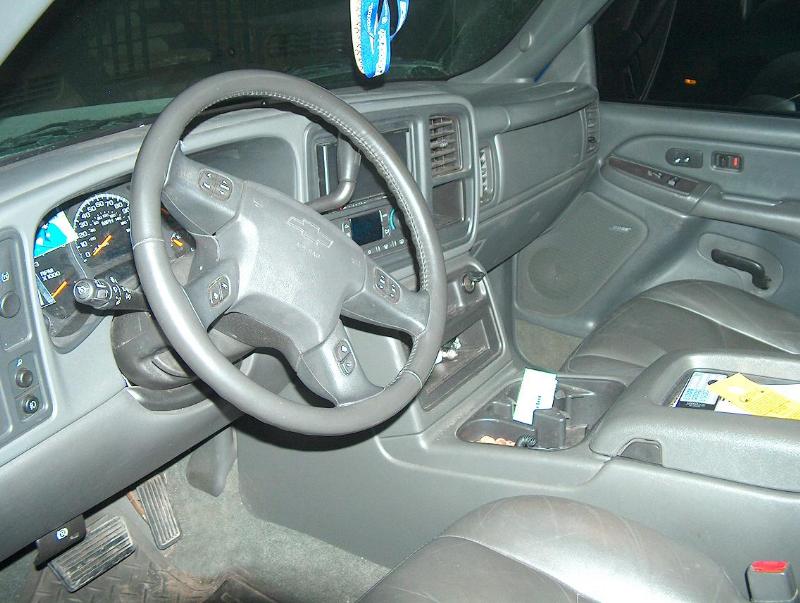 The interior is pretty much stock. Its charcoal gray leather with dual power seats up front. It's loaded with just about every option. Has the towing package, onstar, full driver information center with steering wheel controls, and the bose stereo system. It came with a factory 6 disc in dash changer (which i still have) but i replaced it with a kenwood double din in dash tv with built in dvd player.