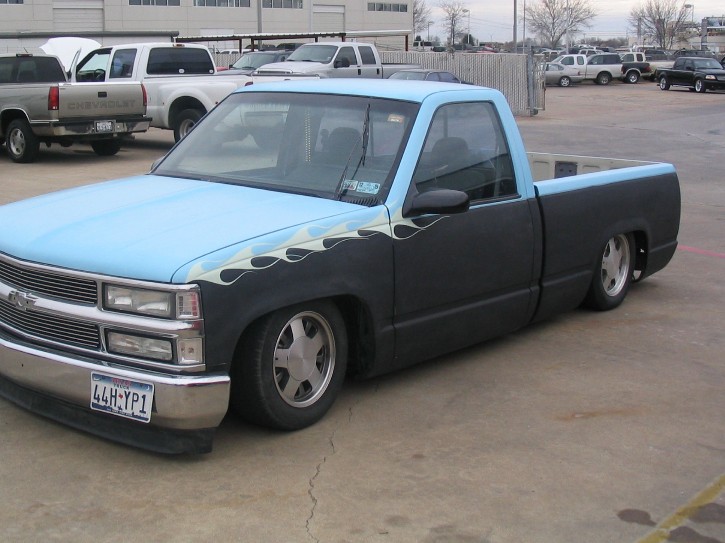 All Shaved with leds for taillights in the tailgate two toned blue with flat black and green flames to separate them just some extra stuff i had layin around the garage
