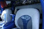 Shaved dash, custom door panels, chopped buckets, custom headliner, seats done in light grey Enduratex, dark grey suede, and blue glitter vinyl, grey Mercedes carpet, custom center console, all work by Plattinum Audio Designs