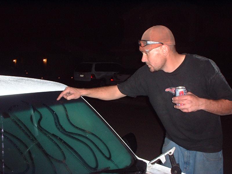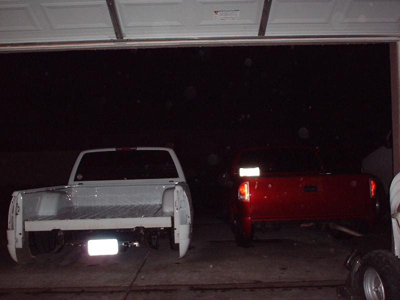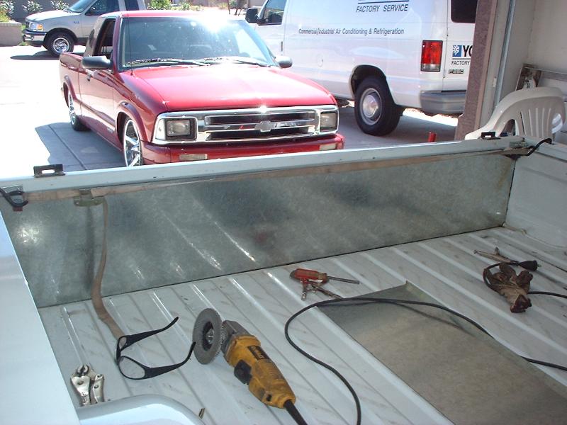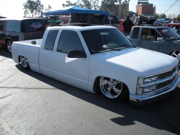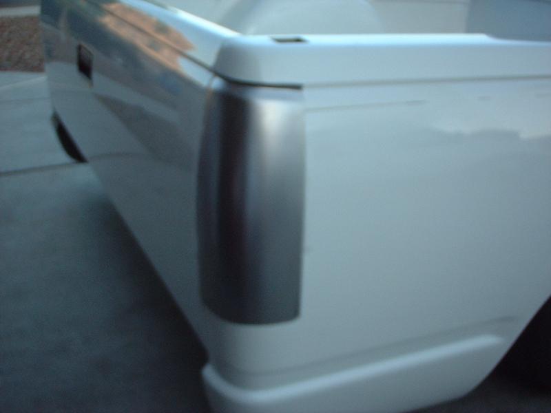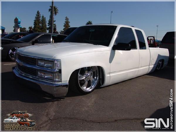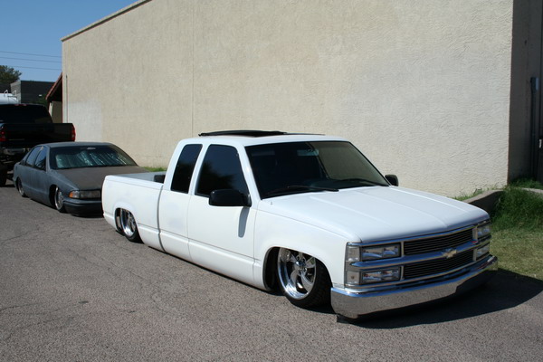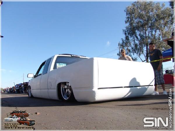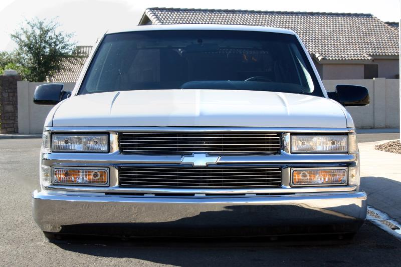 billet grillz, clear head lights, marker and corners up front, trimmed front valance to lay even, licence plate relocated to back window with billet lighted frame, shaved taillights, fbi roll pan,raised bed floor, shaved handles, shaved tail gate, bed caps, whit primer, dark ass tint! 40 x 40 sliding rag