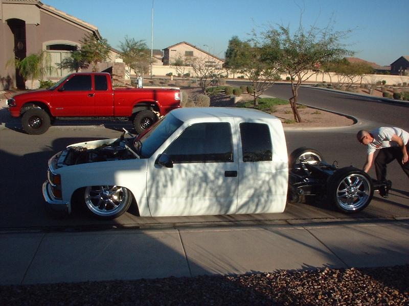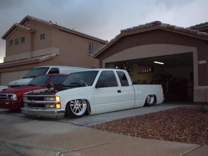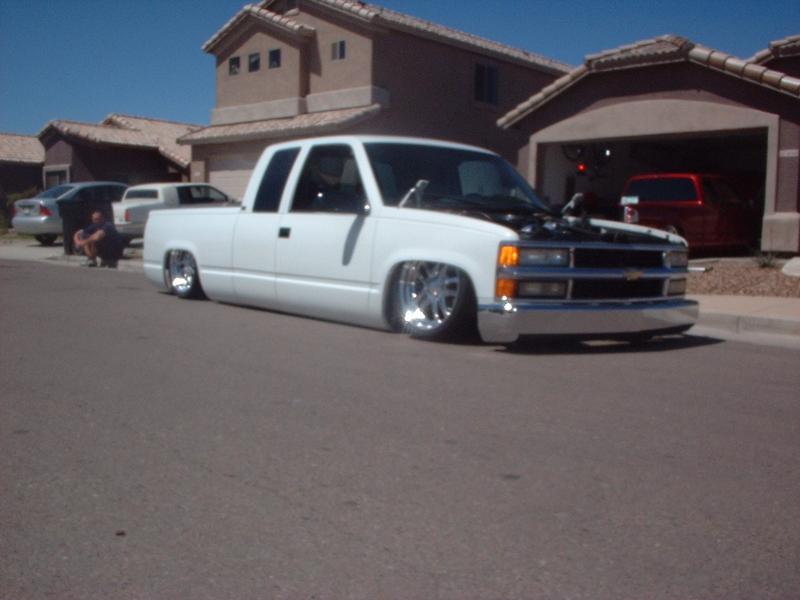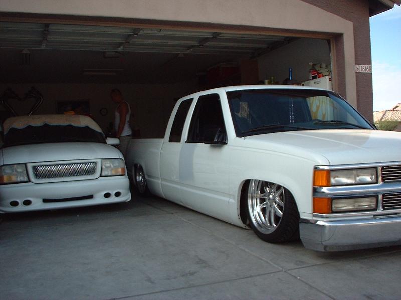 stockfloor bodydrop (bodydrop shop) the waiting game....... 4 link bag on bottom links, shocks rides like a dreram, slam baggs, Spindals up front with triminz for steering linkage, 2-450's 2-3 gallon tanks, guage in cab. 4 push buttons on dash.
