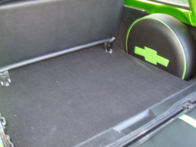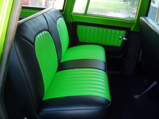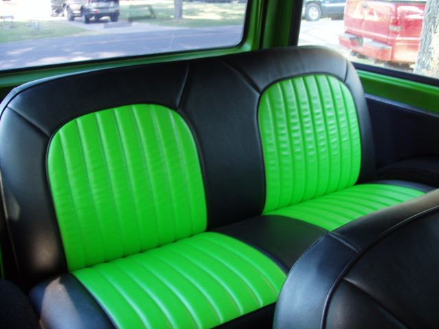 Black Leather w/ Enduratex Lime Cooler inserts. Painted two tone black and antifreeze green to match exterior of truck.