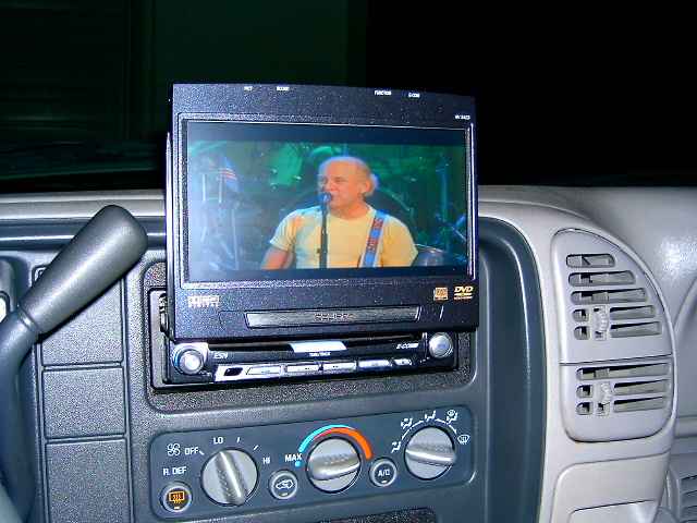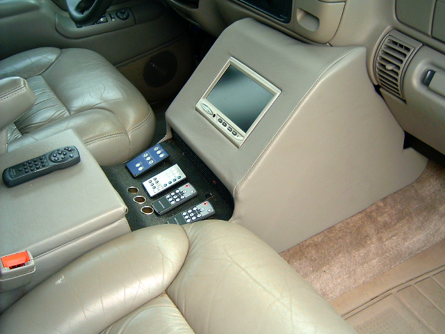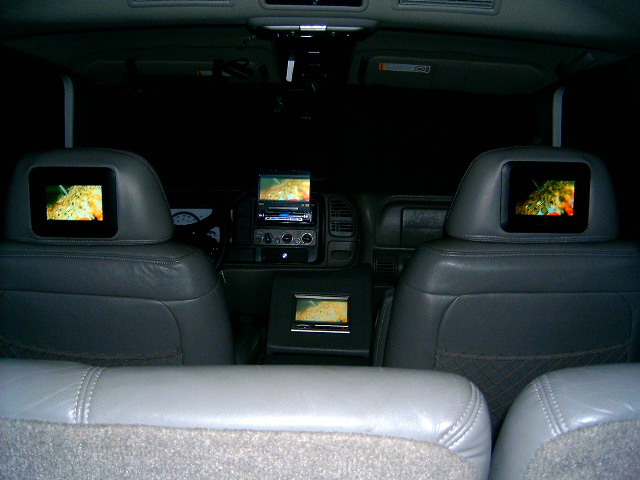 7 inch screen in custom built center console, and 5.6 in screens in front 2 headrest.