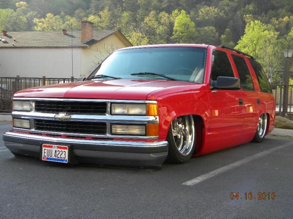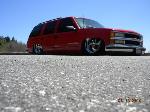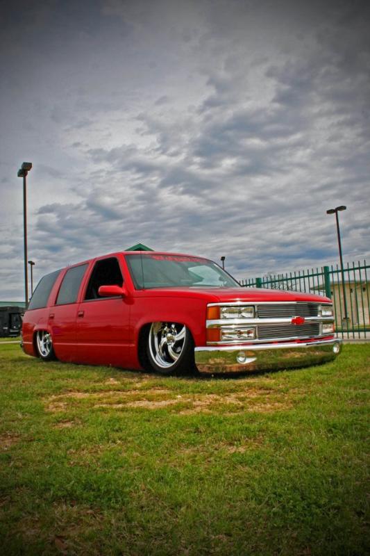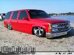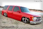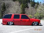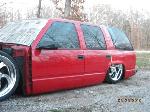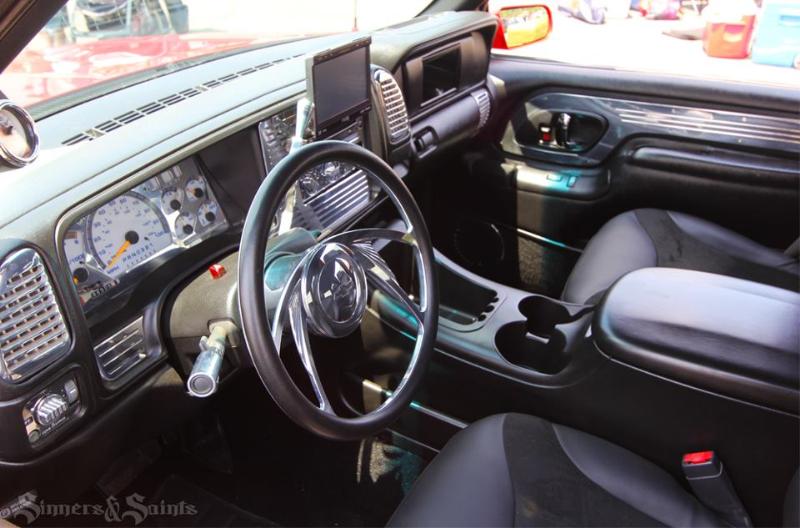 Driveshaft tunnel and fully sheet metaled rear notch and bridge area, fully sounddeadened, black carpet, 02 GMC front seats, modified rear seat, handmade black leather and black suede seat covers, black suede headliner, shaved stock front seat belts, shaved rear cargo cover holes, shaved rear seatbelt holes in B pillars, billet grab handles-dash-door paneltrim-ac vents-climate control-headlight switch-blinker-gear shift-gauge surround-speaker covers-door vents, white face gauges, Billet Specialties steering wheel with bowtie horn, dash dyed black, door panels dyed black with black suede inserts, 7" monitor molded into passenger airbag, 2000 Eddie Bauer Expedition Console, 7" in dash flipout dvd monitor, 7" monitors in head rests, Airlift guages in A pillar pod
